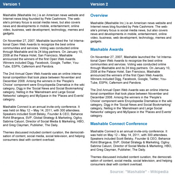 Можно сделать кое-что для того, чтобы приспособиться под это «кружевное» чтение. Во-первых, разбить длинный текст подзаголовками, чтобы пользователь мог легко скользить вниз по странице. Это поддерживает пользовательскую манеру «блочного чтения», так как заголовки автоматически разбивают текст на блоки. А также соответствует манере пользователя просматривать страницу F-образным способом, так как заголовки помогают ему легко двигаться вниз.