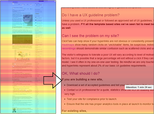 Т.е. когда пользователь смотрит на страницу, он воспринимает её не как единое целое, а как отдельные фрагменты информации. Пользователь бегло просматривает отдельные блоки, которые, как ему кажется, содержат ту информации, которую он активно ищет. Очень хорошо это иллюстрирует тепловая карта, сделанная при помощи прибора Eye Tracker, который фиксирует движение глаза пользователя, когда он смотрит на экран. Пользователи читали кусками: сначала слева направо, потом сверху вниз, пропуская много текста с других сторон, получается подобие буквы F.