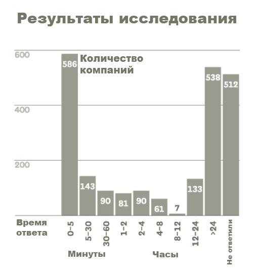 Несмотря на всё вышесказанное, наше исследование показывает, что многие фирмы слишком медленно реагируют на предоставленные данные, то есть на запрос потенциального клиента в онлайне. Нами был проведен аудит 2 241 компаний в США, в ходе которого измерялась длительность реакции на заинтересованность клиента после перехода на сайт компании. И хотя 37% компаний отреагировали на запрос потенциального клиента в пределах часа, а 16% — в пределах 24 часов, 24% тестируемых отреагировало более чем через сутки, а 23% компаний не отреагировало вовсе. Среднее время реакции среди компаний, отреагировавших в пределах 30 дней, составляло 42 часа.